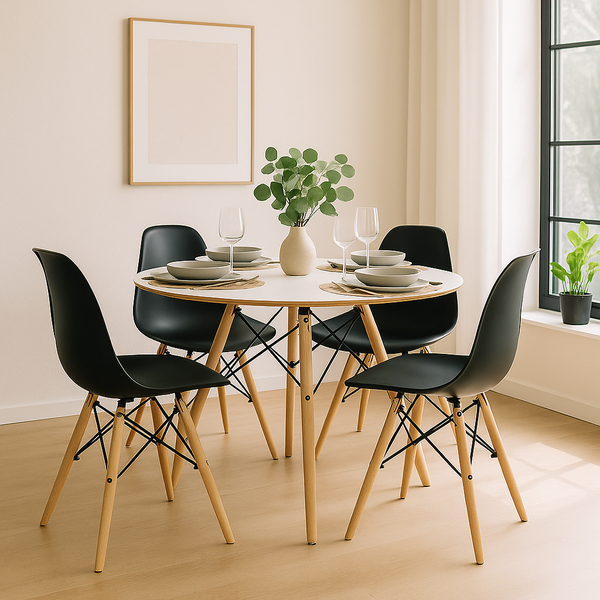 O Conjunto Mesa Eames DSW 90cm Redonda com 4 Cadeiras Eames DSW em Madeira é a escolha ideal para quem busca design moderno, conforto e resistência em ambientes internos. Seu visual contemporâneo valoriza a composição do espaço, enquanto a estrutura em madeira das cadeiras proporciona estabilidade e durabilidade para o uso diário. Compacto e funcional, o conjunto é perfeito para otimizar salas de jantar e áreas gourmet com elegância e praticidade.